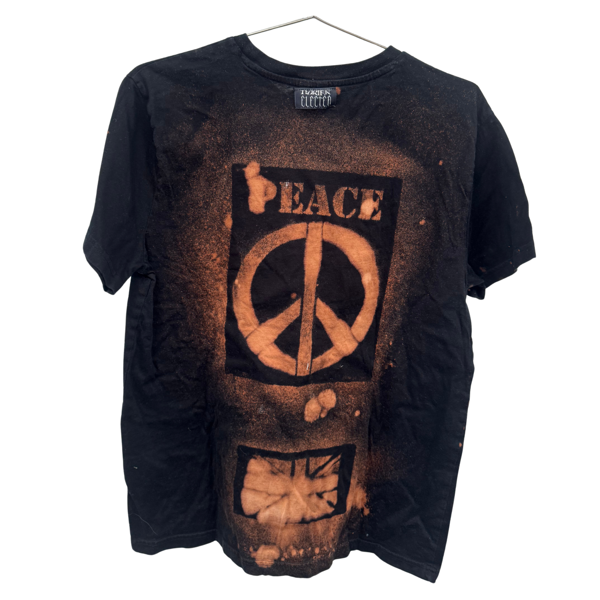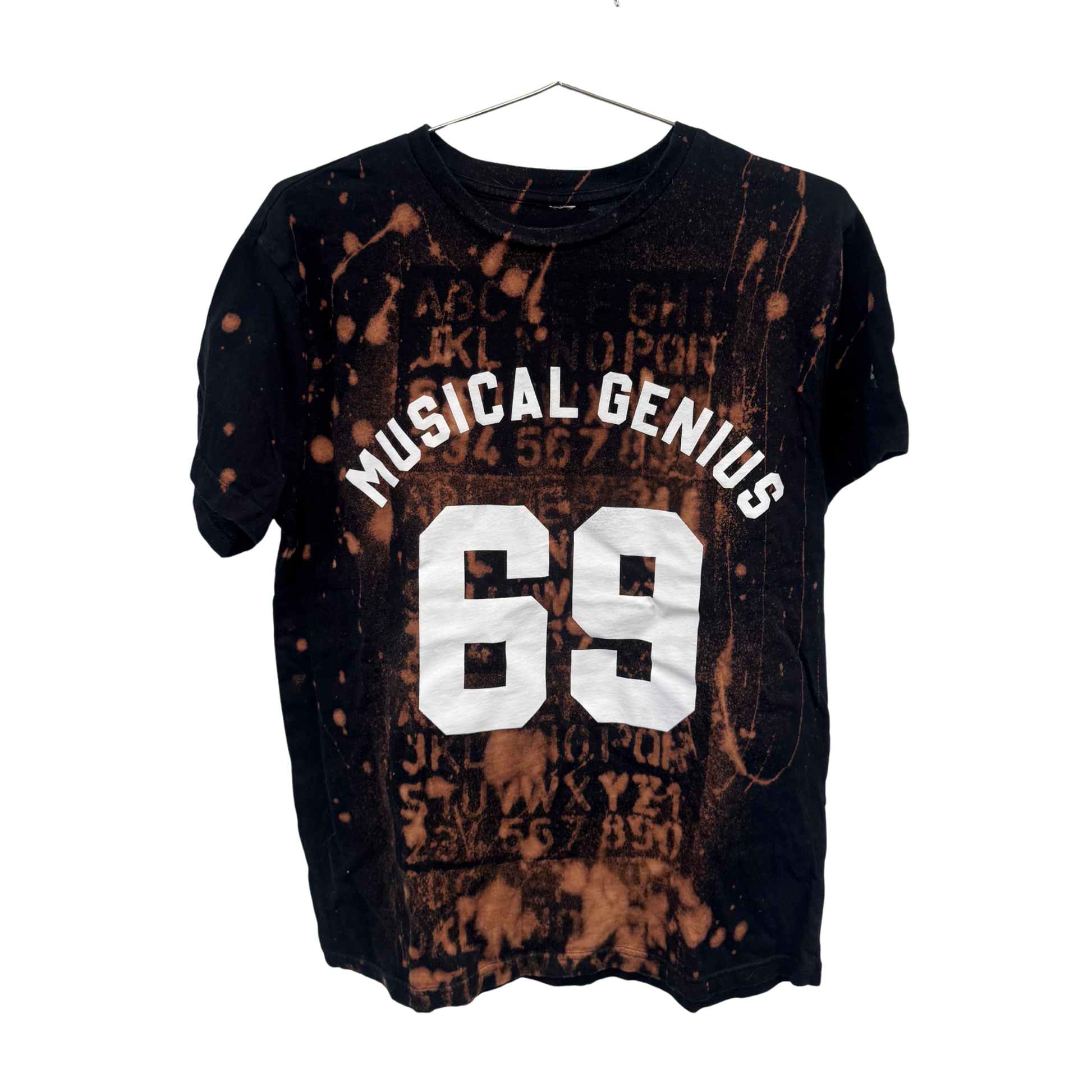 Bleach dyed and stenciled "Musical Genius 69" black tee