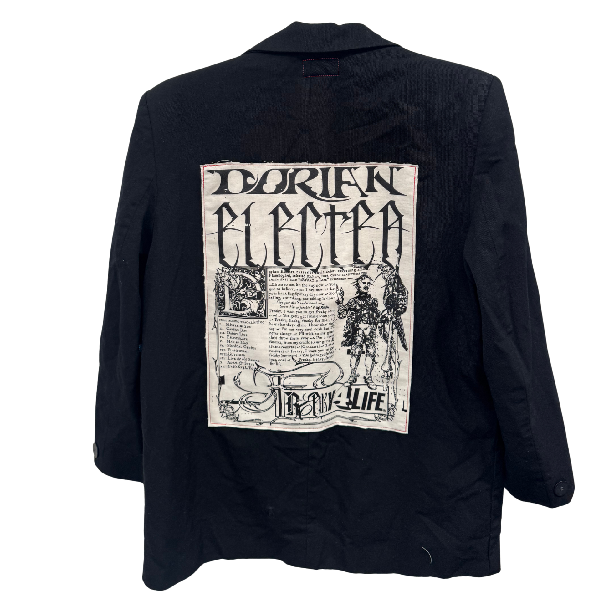 Plaid argyle patches from scraps, DE musical star and tablet patch, black blazer. Shorter sleeves!