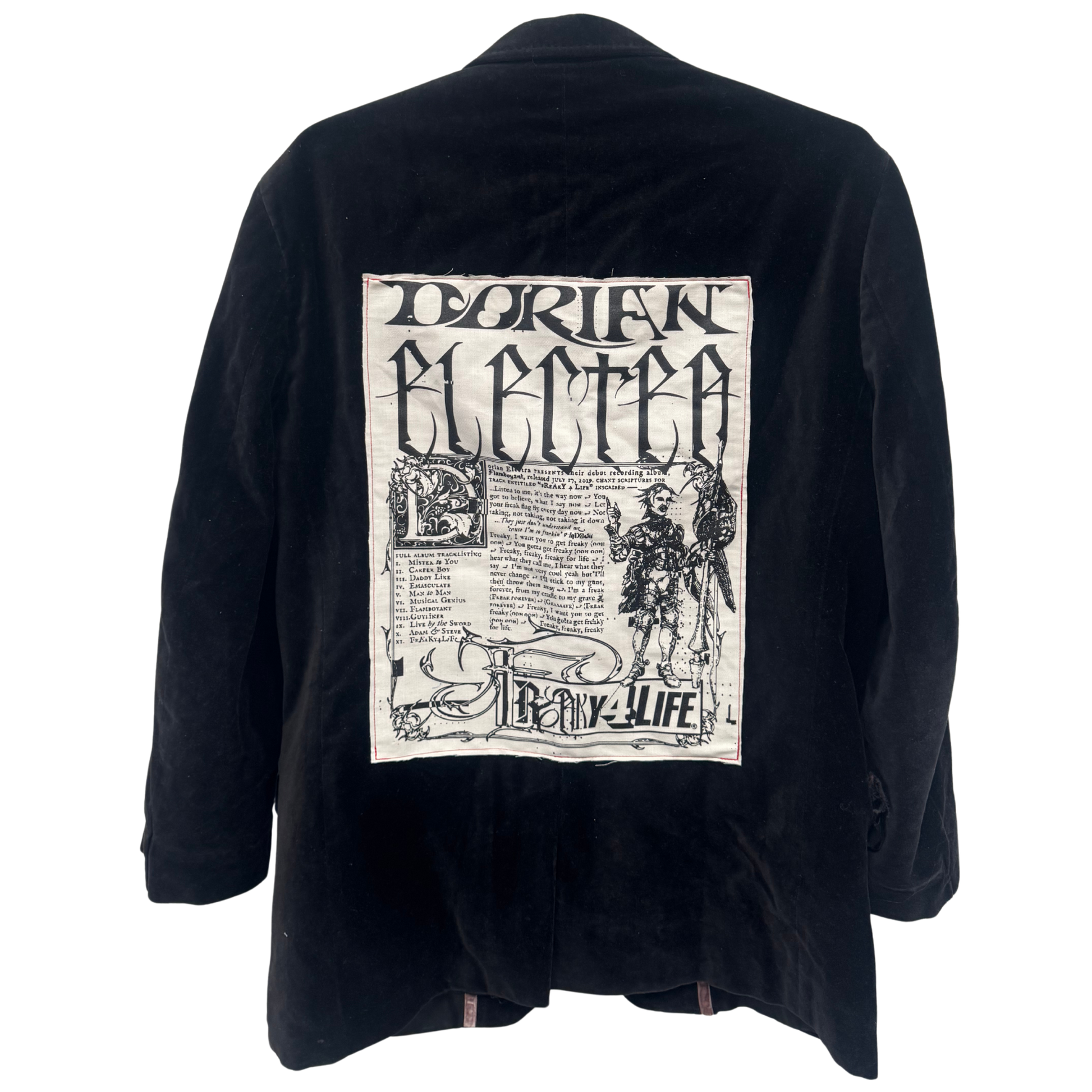 Plaid and denim patches from scraps, DE musical star, and tablet patch, black blazer - shorter sleeves.