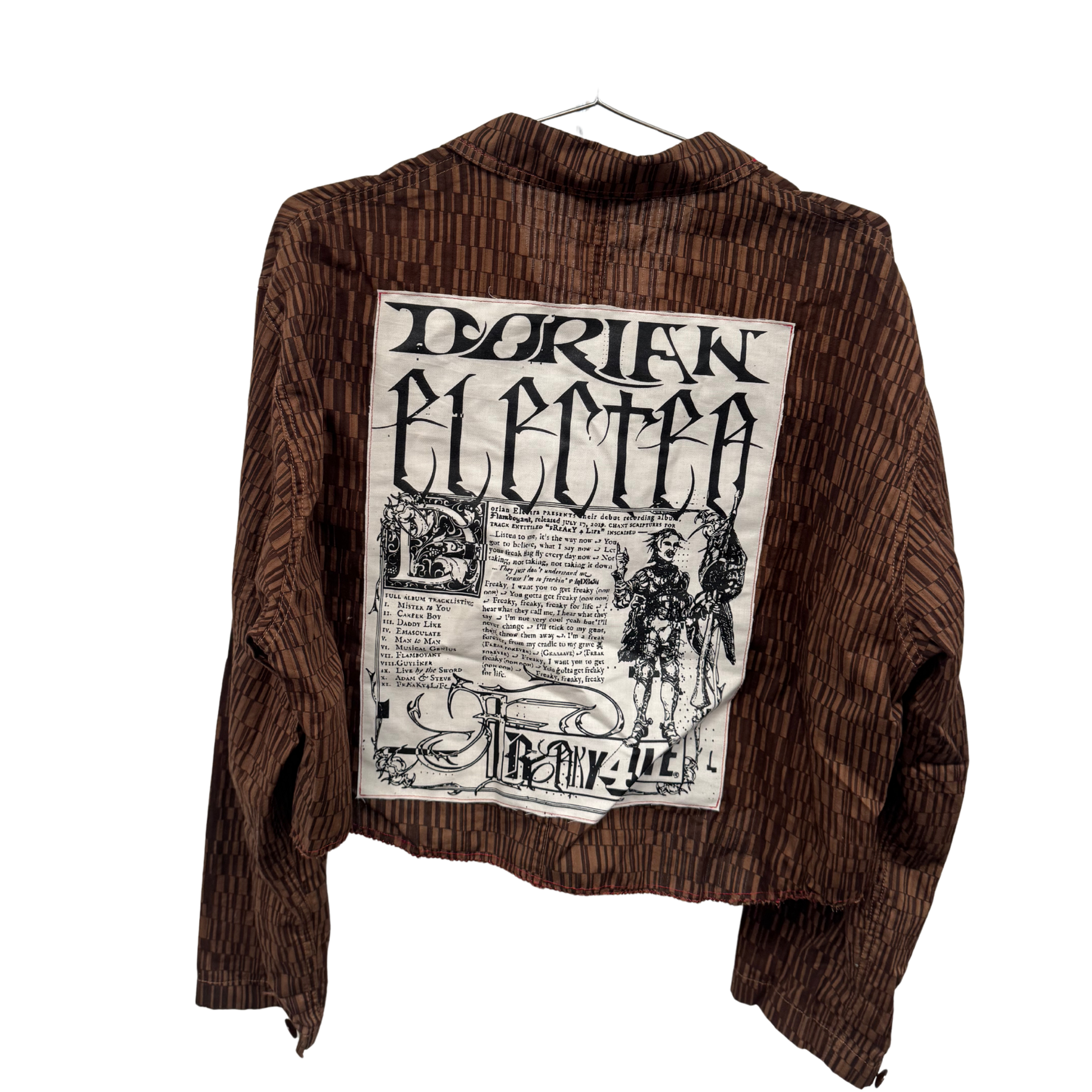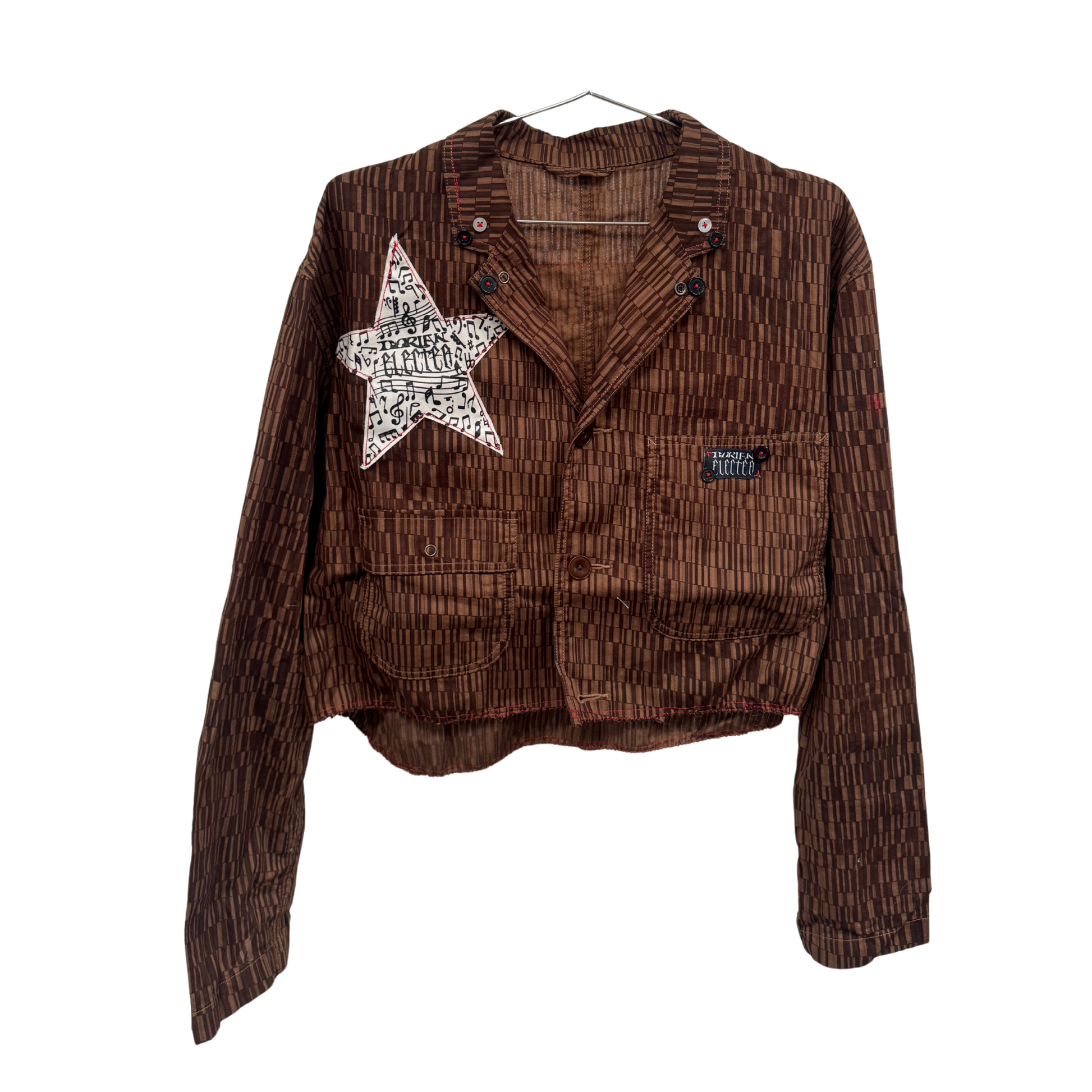 Buttons from cropped pieces, DE musical star patch, and tablet, brown geometric print, cropped, light jacket.