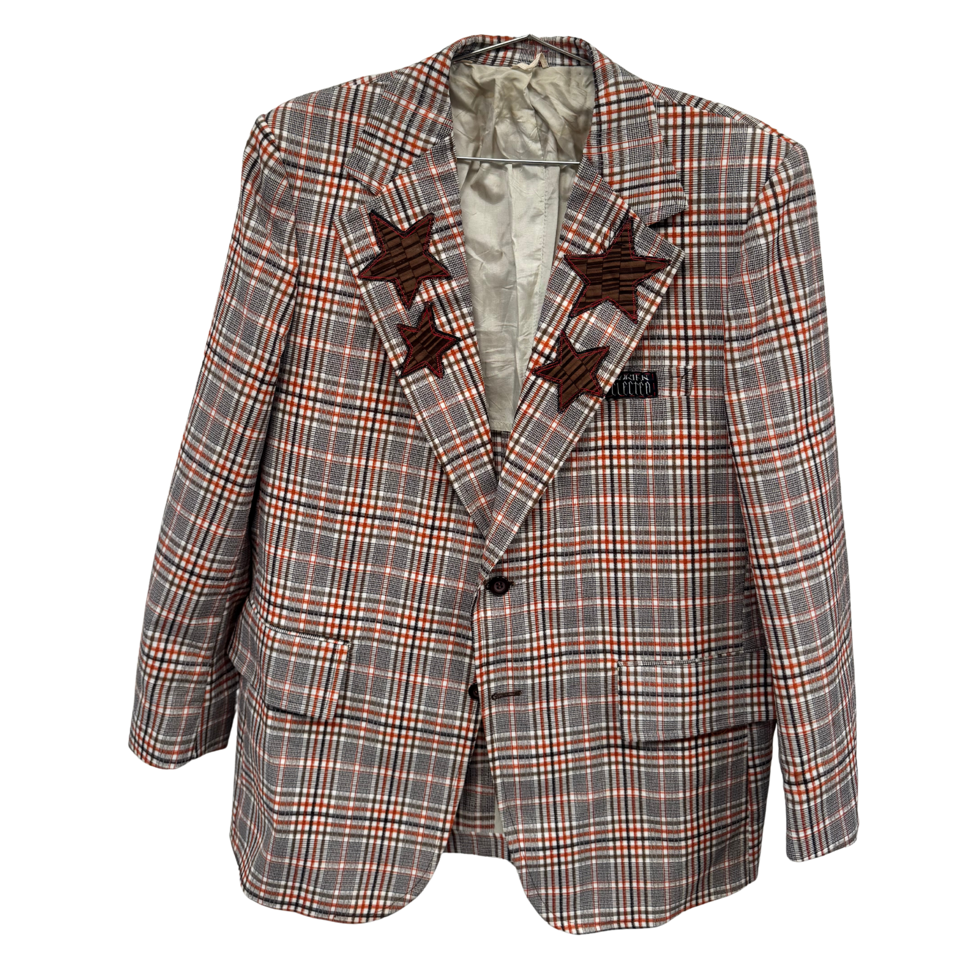 Print and denim star patches from scraps, DE musical banner collar tag, plaid blazer.