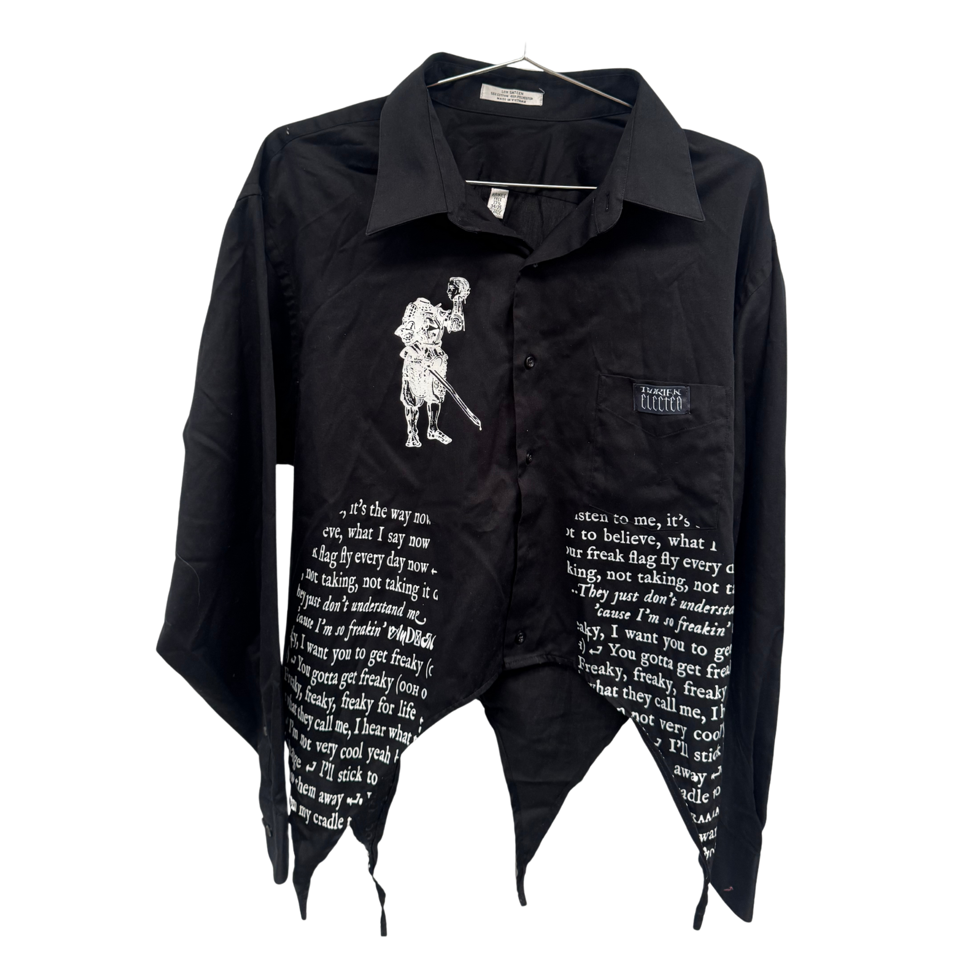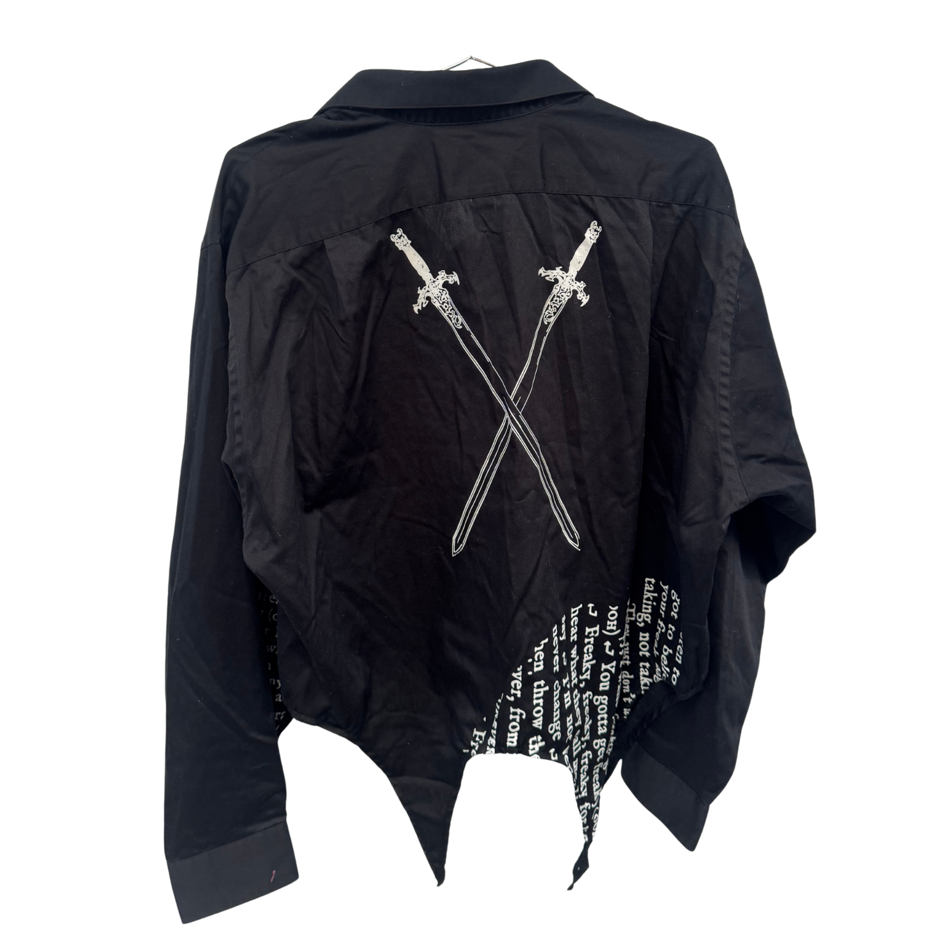 Printed (headless knight, double sword, lyric blocks), pointed hem, on a black button down.