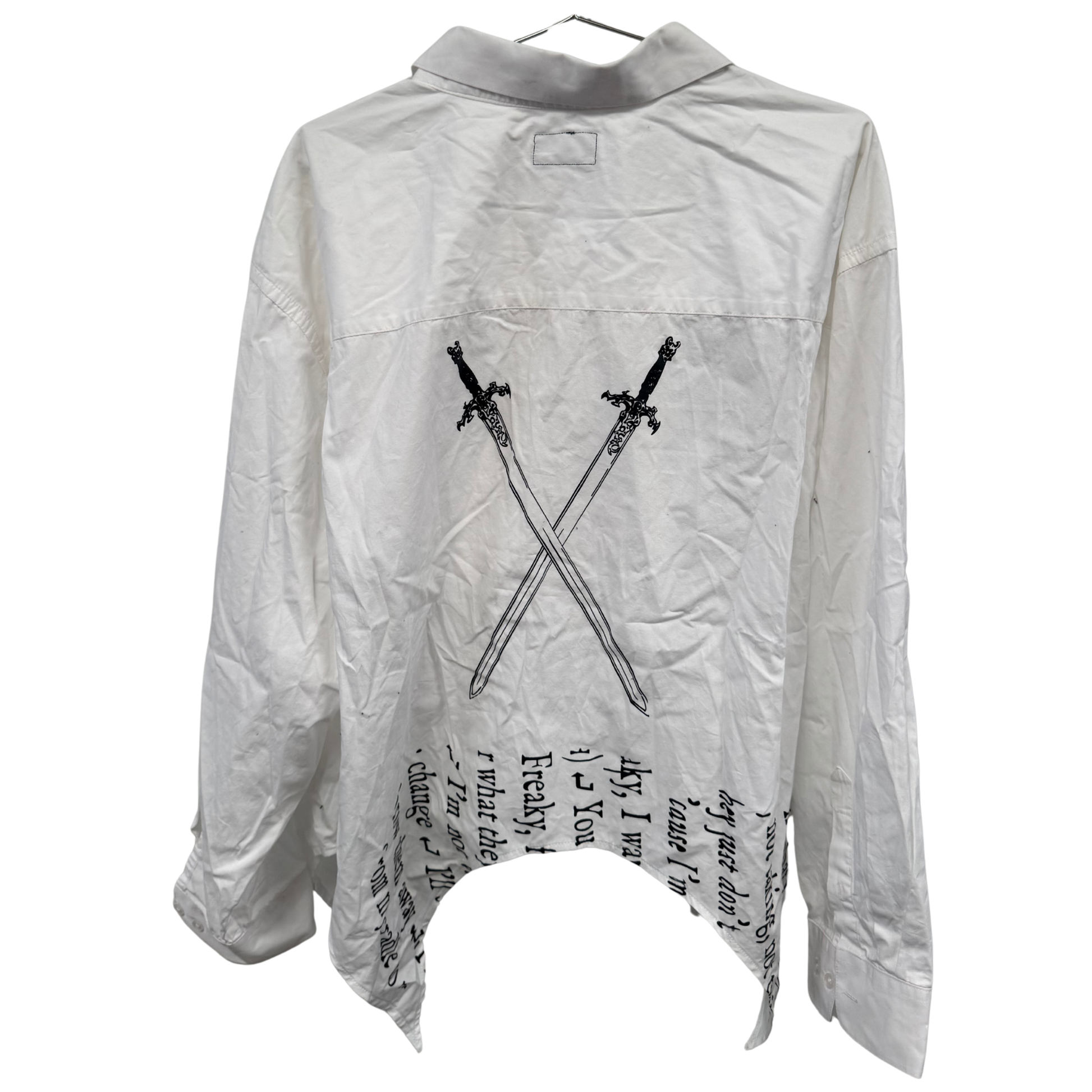 Printed (headless knight, double sword, lyric blocks), tracklist pocket tag, pointed hem, white button-down.