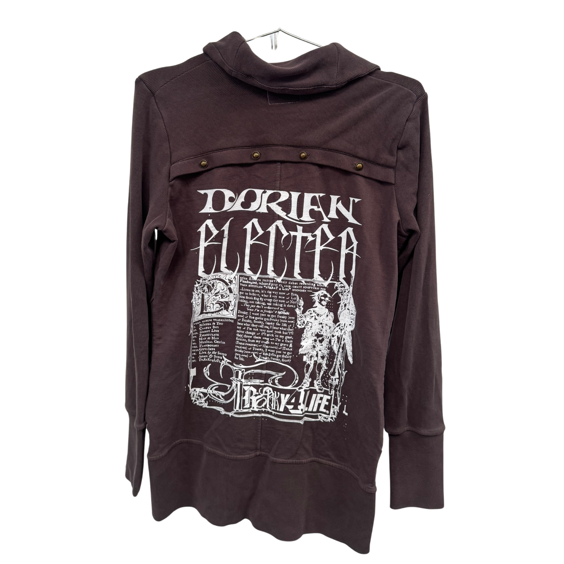 Printed musical genius, DE musical star, tablet, sword sleeves, brown turtleneck jacket.